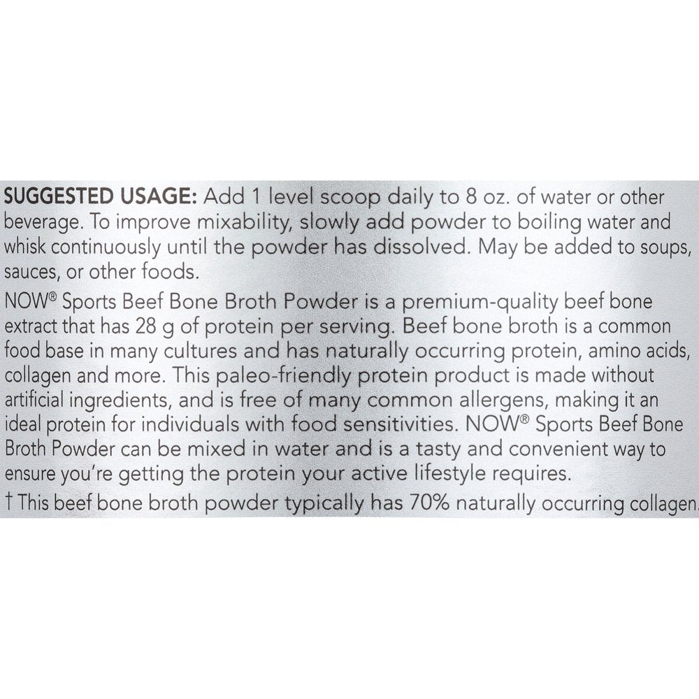 Paleo Friendly 28 g Protein 63% Natural Collagen† Steroid Free Non-GMO Informed Sport - We Test • You Trust Informed Choice - We Test • You Trust No Artificial Sweeteners No Aspartame No Sucralose No Acesulfame-K GMP Quality Assured NOW® Sports Beef Bone Broth Powder is a premium-quality beef bone extract that has 28 g of protein per serving. Beef bone broth is a common food base in many cultures and has naturally occurring protein, amino acids, collagen and more. This paleo-friendly protein product is made without artificial ingredients, and is free of many common allergens, making it an ideal protein for individuals with food sensitivities. NOW® Sports Beef Bone Broth Powder can be mixed in water and is a tasty and convenient way to ensure you’re getting the protein your active lifestyle requires. †This beef bone broth powder typically has 63% naturally occurring collagen.