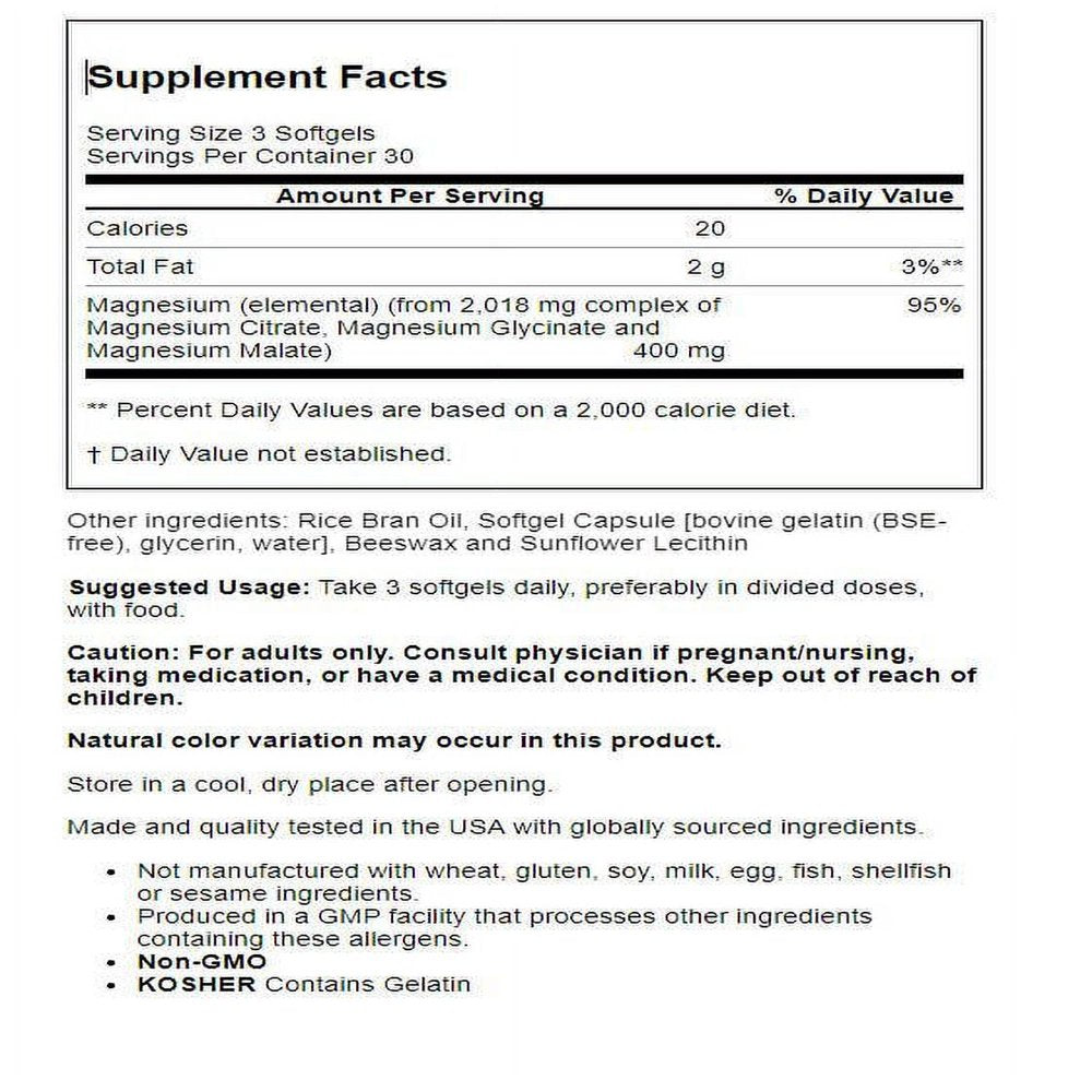 Superior Bioavailability*With Glycinate & MalateMagnesium is a mineral that is critical for energy production and metabolism, muscle contraction, nerve impulse transmission, and bone mineralization. It is a required cofactor for an estimated 300 enzymes. Among the reactions catalyzed by these enzymes are fatty acid synthesis, protein synthesis, and glucose metabolism. Magnesium status is also important for regulation of calcium balance through its effects on the parathyroid gland. Magnesium Citrate is easily absorbed, and NOW® Magnesium Citrate Softgels are provided in a liquid base with chelated forms for superior bioavailability.*
