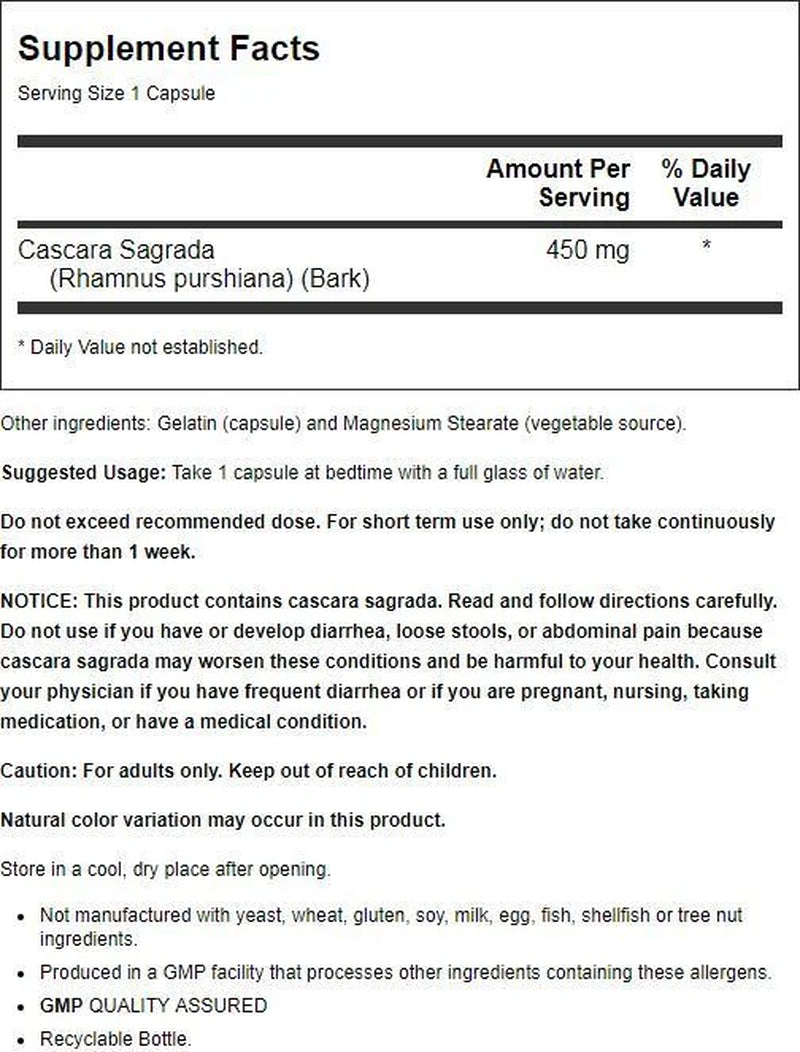 | Product Name | NOW Supplements, Cascara Sagrada (Rhamnus purshiana) 450 mg, Herbal Regularity*, 100 Veg Capsules |