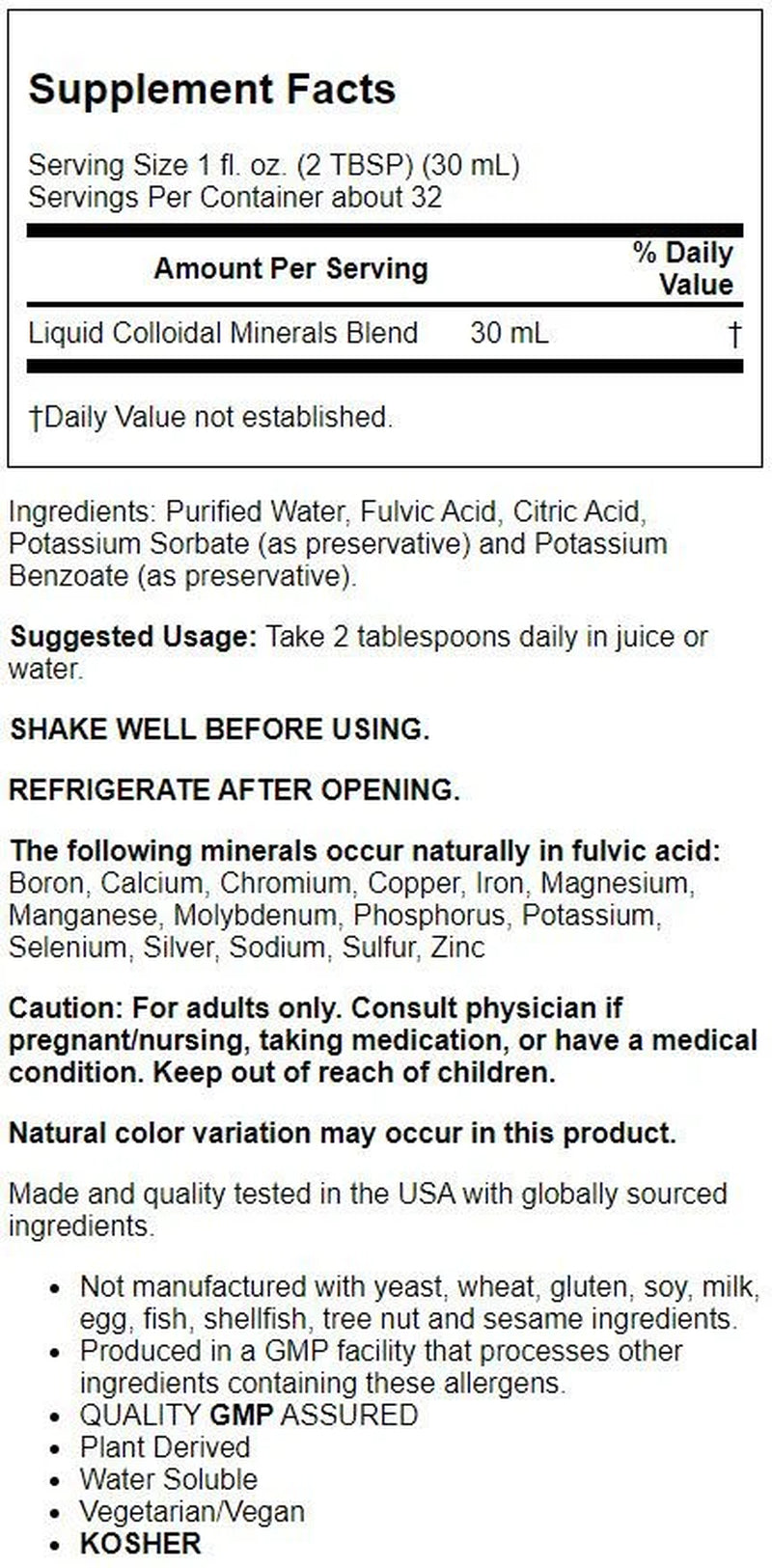 NOW® Colloidal Minerals is comprised of highly absorbable, water-soluble minerals derived from prehistoric plant deposits in Utah. Each 1 ounce serving has naturally occurring trace amounts of many major and trace minerals. These colloidal minerals were created ages ago when they became incorporated into the living plants, fruits, and vegetables of that era. These trace elements helped to form the luscious vegetation which contributed to the vibrant life which flourished on this planet. The following minerals occur naturally in fulvic acid: Boron, Calcium, Chromium, Copper, Iron, Magnesium, Manganese, Molybdenum, Phosphorus, Potassium, Selenium, Silver, Sodium, Sulfur, and Zinc. Take 2 tablespoons (1 fl. oz.) daily in juice or water. Shake well before use. Refrigerate after opening.