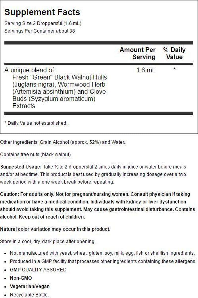 "Green" Black Walnut Wormwood Complex is an herbal formulation that combines three traditional herbal extracts in one convenient liquid supplement. This product is manufactured with extracts of unripe (green) black walnut hulls (Juglans nigra), wormwood (Artemisia absinthium) and clove buds (Syzgium aromaticum). Natural color variation may occur in this product.