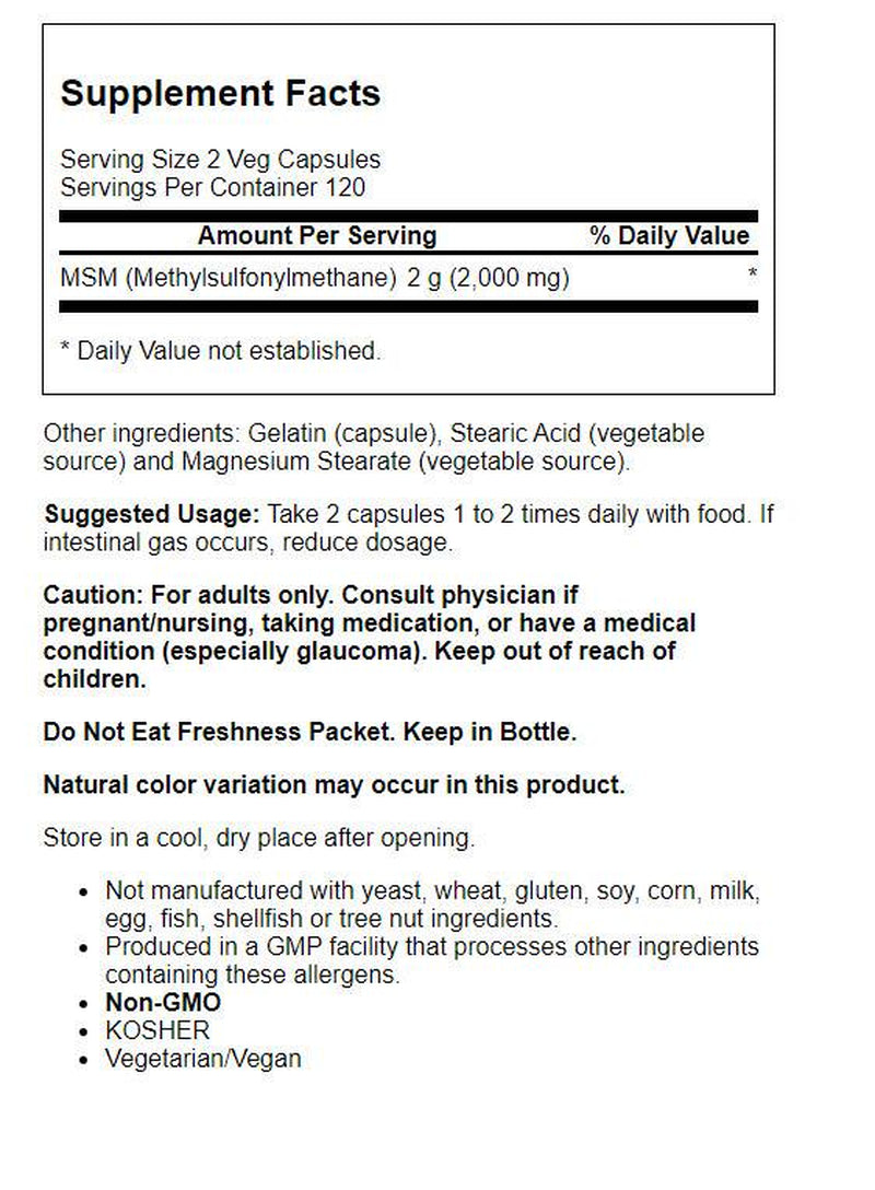 MSM (Methylsulfonylmethane) is a sulfur-bearing compound that is naturally present in very small amounts in fruits, vegetables, grains, animal products, and some algae. Sulfur compounds are found in all body cells and are indispensable for life.* MSM, in its role in the body's sulfur cycle, helps to create the chemical links needed to form and maintain numerous different types of structural tissues of the human body, including connective tissues, such as articular cartilage and skin.* Natural color variation may occur in this product.