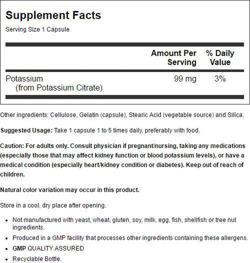 Potassium is an essential mineral that is widely distributed among food sources, with especially high levels present in fruits and vegetables. Potassium is critical for the maintenance of normal whole-body and cellular fluid levels, as well as for the maintenance of acid-base balance.* It is also necessary for proper muscle contraction, the maintenance of healthy heart function, and for the transmission of nerve impulses.* Potassium citrate is a well absorbed and highly bioavailable form of potassium. Natural color variation may occur in this product. Take 1 capsule 1 to 5 times daily, preferably with food.