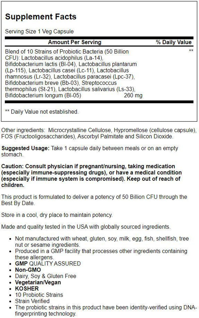 Supplement FactsServing Size:1 Veg CapsuleServings Per Container:50DescriptionAmount per Serving% Daily ValueBlend of 10 Strainsof Probiotic Bacteria (50 Billion CFU):Lactobacillus acidophilus (La-14), Bifidobacterium lactis (Bl-04), Lactobacillus plantarum (Lp-115), Lactobacillus casei (Lc-11), Lactobacillus rhamnosus (Lr-32), Lactobacillus paracasei (Lpc-37), Bifidobacterium breve (Bb-03), Streptococcus thermophilus (St-21), Lactobacillus salivarius (Ls-33), Bifidobacterium longum (Bl-05) 260 mg ** Daily Value not established. **Daily Value not established.Other Ingredients: Microcrystalline Cellulose, Hypromellose (cellulose capsule), FOS (Fructooligosaccharides), Ascorbyl Palmitate and Silicon Dioxide. Not manufactured with wheat, gluten, soy, milk, egg, fish, shellfish, tree nut or sesame ingredients. Produced in a GMP facility that processes other ingredients containing these allergens. Caution: Consult physician if pregnant/nursing, taking medication (especially immune-suppressing drugs), or have a medical condition (especially if immune system is compromised). Keep out of reach of children. Storage Guidance: Store in a cool, dry place to maintain potency. This product is formulated to deliver a potency of 50 Billion CFU through the Best By date. The probiotic strains in this product have been identity-verified using DNA-fingerprinting technology. Made and quality tested in the USA with globally sourced ingredients. Family owned since 1968./div>