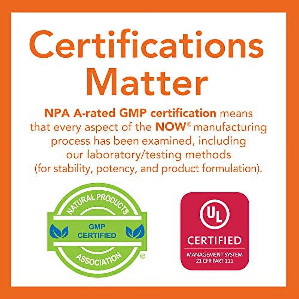 - GMP Quality Assured: NPA A-rated GMP certification means that every aspect of the NOW manufacturing process has been examined, including our laboratory/testing methods (for stability, potency, and product formulation).