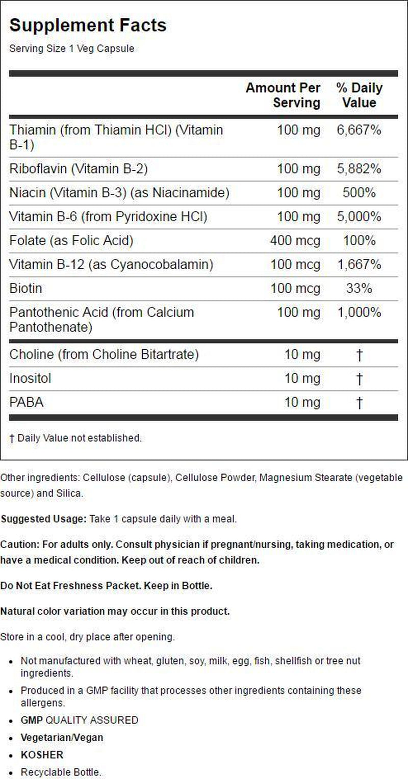 - B-COMPLEX FOR MAXIMUM EFFECTIVENESS/VEGAN: B-100 Caps provide a full complement of B-vitamins plus choline and inositol. Also includes 400 mcg folic acid.
