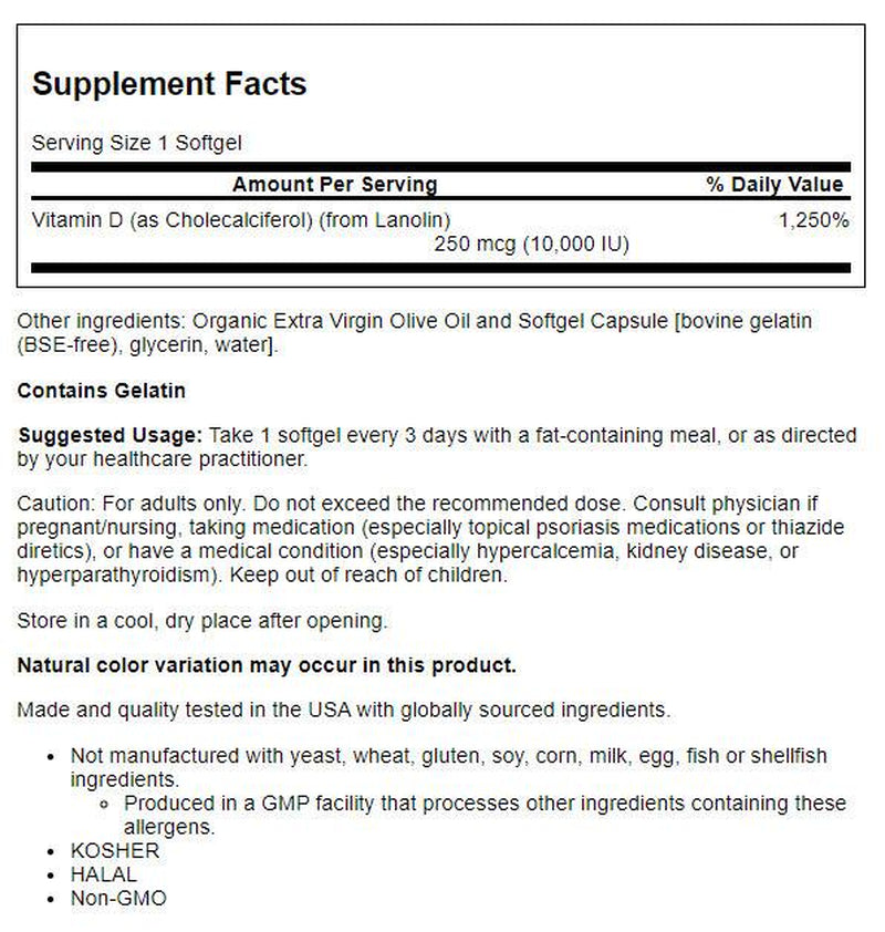Vitamin D-3 softgels supply this key vitamin in a highly absorbable liquid softgel form. Vitamin D is normally obtained from the diet or produced by the skin from the ultraviolet energy of the sun. However, it is not abundant in food. As more people avoid sun exposure, vitamin D supplementation becomes even more necessary to ensure that your body receives an adequate supply. Natural color variation may occur in this product.