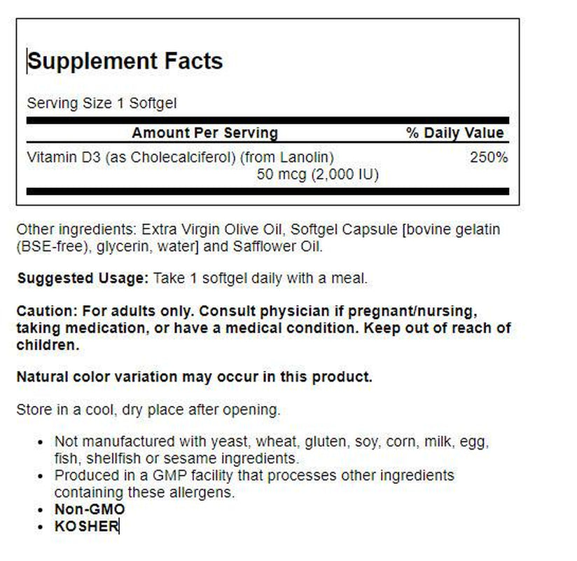 Vitamin D-3 softgels supply this key vitamin in a highly absorbable liquid softgel form. Vitamin D is normally obtained from the diet or produced by the skin from the ultraviolet energy of the sun. However, it is not abundant in food. As more people avoid sun exposure, vitamin D supplementation becomes even more necessary to ensure that your body receives an adequate supply.