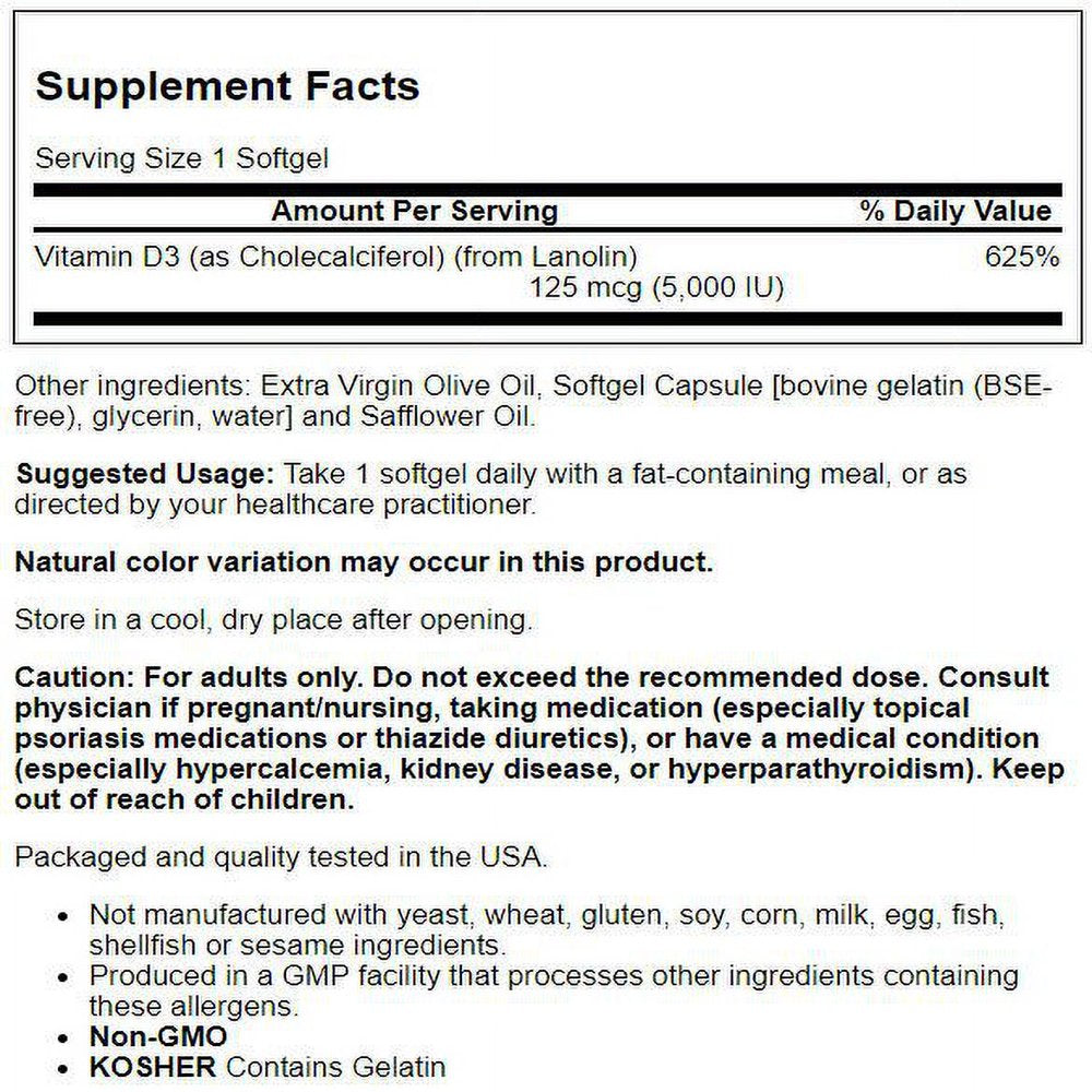 NOW® Supplements Vitamin D-3 5000 IU softgels supply this key vitamin in a highly-absorbable liquid softgel form. Vitamin D is normally obtained from the diet or produced by the skin from the ultraviolet energy of the sun. However, it is not abundant in food. As more people avoid sun exposure, vitamin D supplementation becomes even more necessary to ensure that your body receives an adequate supply. Natural color variation may occur in this product.