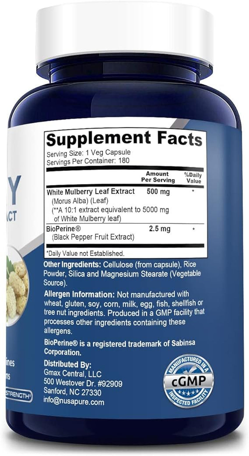 Nusapure 5,000Mg White Mulberry Leaf Extract 180 Veggie Caps with Bioperine, a Vegetarian Dietary Supplement Promoting Adult Wellness, Better Health, and a Unisex Approach