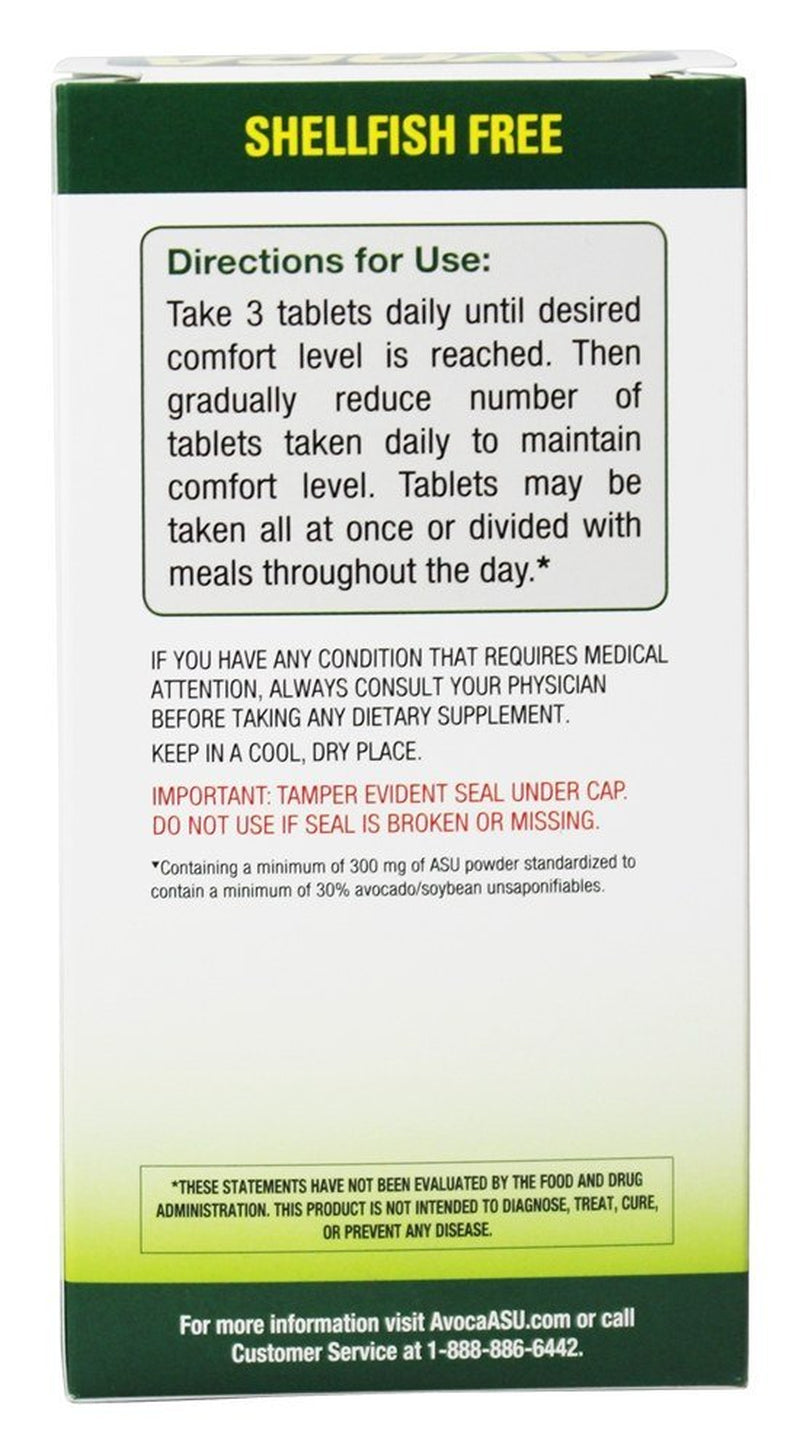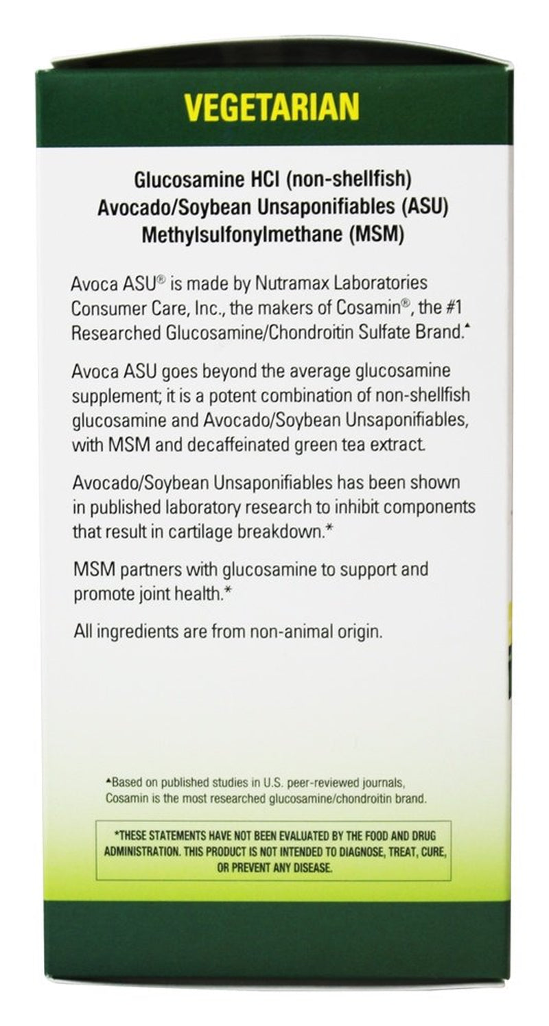the makers of Cosamin, the #1 researched glucosamine/chondroitin sulfate brand.Avoca ASU goes beyond the average glucosamine supplement; it is a potent combination of non-shell-fish glucosamine Avocado/Soybean Unsaponifiables, with MSM and decaffeinated green tea extract.Avocado/Soybean Unsaponifiables has been shown in published laboratory research to inhibit componenets that result in cartilage breakdown