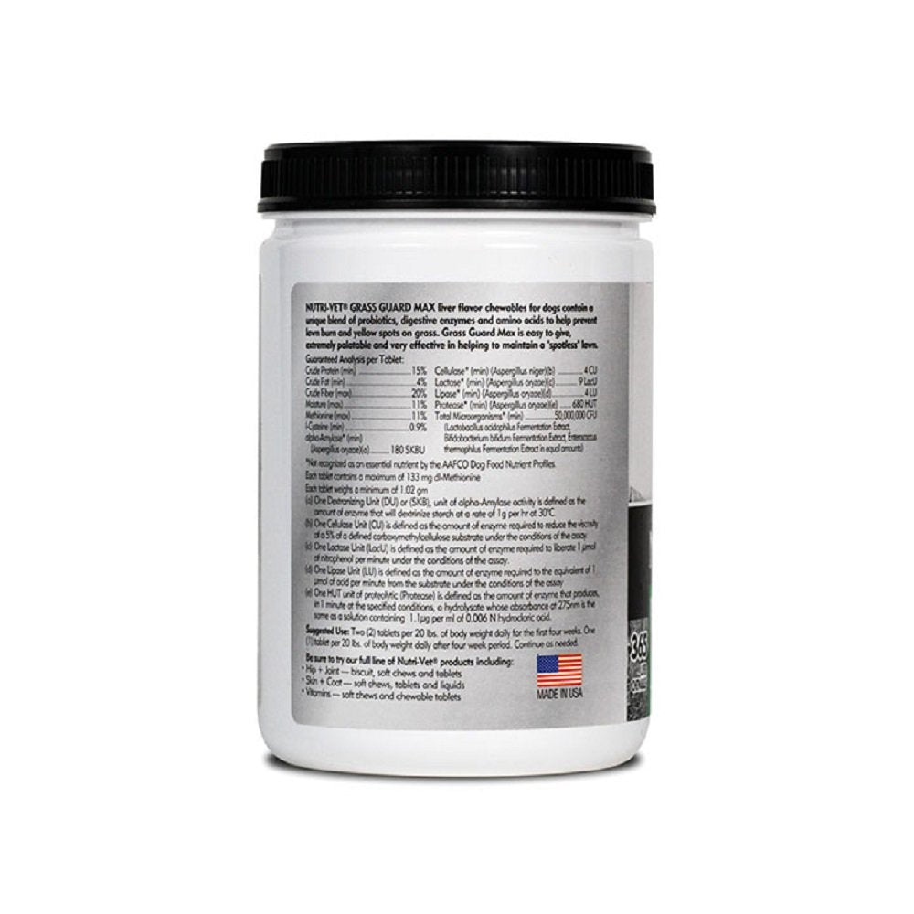 Nutri-Vet Grass Guard Max liver flavor chewables for dogs contain a unique blend of probiotics, digestive enzymes and amino acids to help prevent lawn burn and yellow spots on grass. Grass Guard Max is easy to give, extremely palatable and very effective in helping to maintain a 'spotless' lawn.
