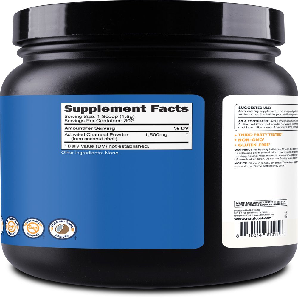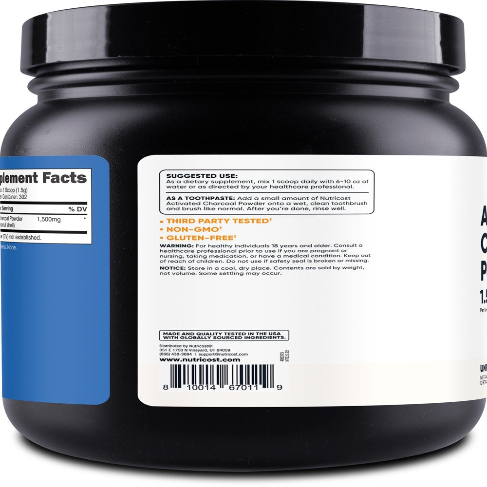 Activated charcoal is known for its absorbent properties. Nutricost Activated Charcoal contains 1lb of powder per bottle. Add to your daily brushing routine for teeth whitening. This supplement is gluten free and non-GMO. All Nutricost products are made in a GMP Compliant, FDA Registered Facility and all ingredients and finished products are tested by 3rd party, iso-accredited laboratories. Only What You Need, Nothing You Don't! We've simplified our entire philosophy down to that single concept. This motto is what drives us to find the highest quality sources of the purest ingredients for each supplement we offer. From single ingredients to our simple formulations for targeted effects, each of our supplements stays clear and simple with what they provide.