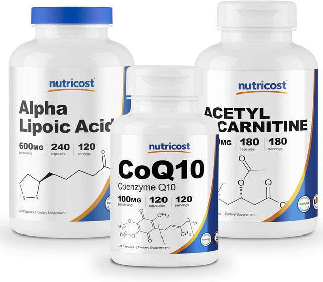 Get all 3 high quality Nutricost products. This includes one bottle each of: Nutricost Alpha Lipoic Acid 600mg, 240 Caps; Nutricost CoQ10 100mg, 120 Caps; and Nutricost Acetyl L-Carnitine 500mg, 180 Capsules. These products are all non-gmo, gluten free, and 3rd party tested.