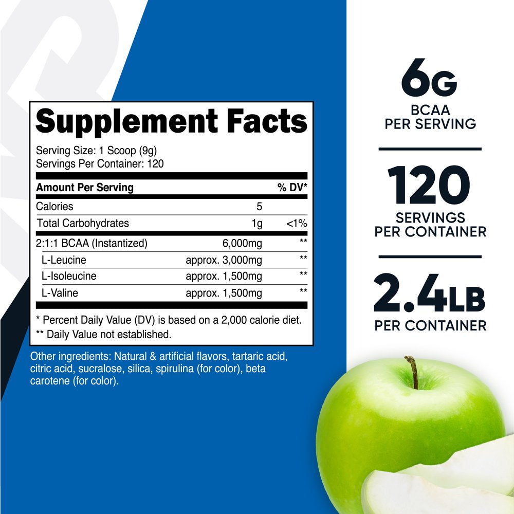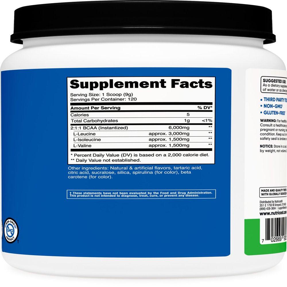 Nutricost BCAA is 120 servings of delicious green apple naturally flavored with other natural flavors. Branched-chain amino acids are essential compounds for your body. Nutricost BCAAs are vegetarian friendly, gluten free, and non-GMO. All Nutricost products are made in a GMP Compliant, FDA Registered Facility and all ingredients and finished products are tested by 3rd party, iso-accredited laboratories. Only What You Need, Nothing You Don't! We've simplified our entire philosophy down to that single concept. This motto is what drives us to find the highest quality sources of the purest ingredients for each supplement we offer. From single ingredients to our simple formulations for targeted effects, each of our supplements stays clear and simple with what they provide.