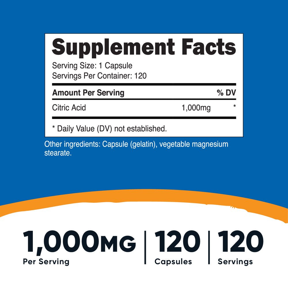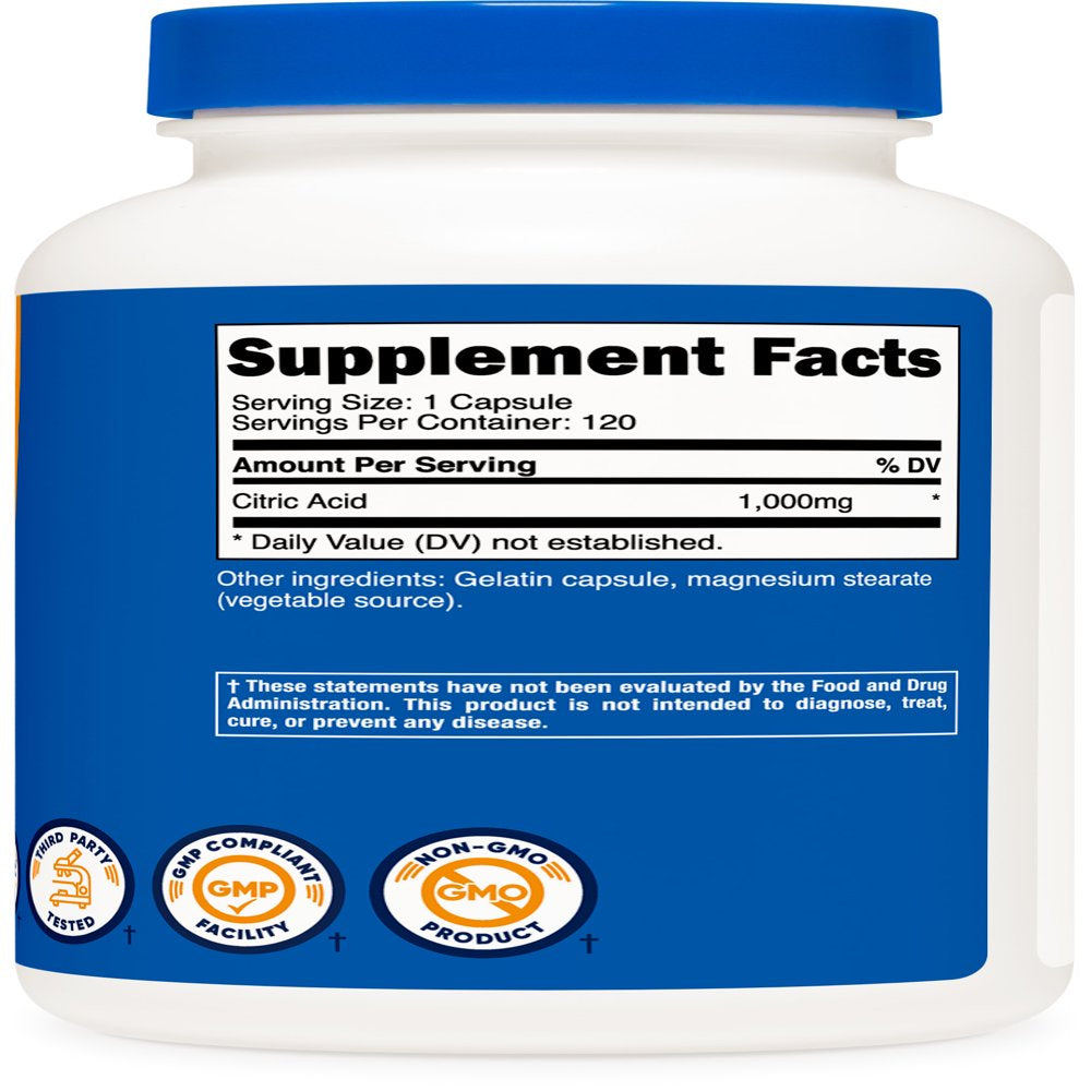 Nutricost Citric Acid 1000Mg (1 Gram), 120 Capsules - Gluten Free, Non-Gmo Supplement