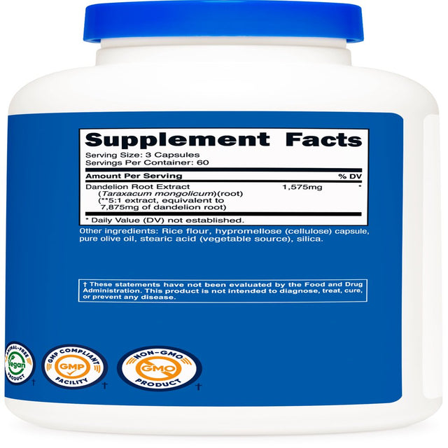 Dandelion Root has a number of beneficial properties. Try Nutricost's Dandelion Root Extract supplement for natural support for your body! Each capsule contains 525mg of potent (5:1!) dandelion extract for a 1,575mg serving size. Each bottle has 180 capsules (60 servings). This supplement is gluten free, non-gmo, and vegetarian friendly. Nutricost, located and headquartered in the USA, only uses the best ingredients to ensure maximum quality and to help you feel your best! By keeping our supplement recipes simple and clean, you get the best experience possible with Nutricost. Our supplements are manufactured in a GMP-compliant and FDA-registered facility; and each batch of every product is tested by independent, ISO-accredited laboratories. These statements have not been evaluated by the Food and Drug Administration. This product is not intended to diagnose, treat, cure, or prevent any disease.
