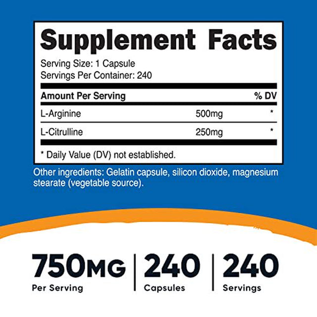 Nutricost L-Arginine L-Citrulline Complex 750Mg, 240 Capsules - Non-Gmo