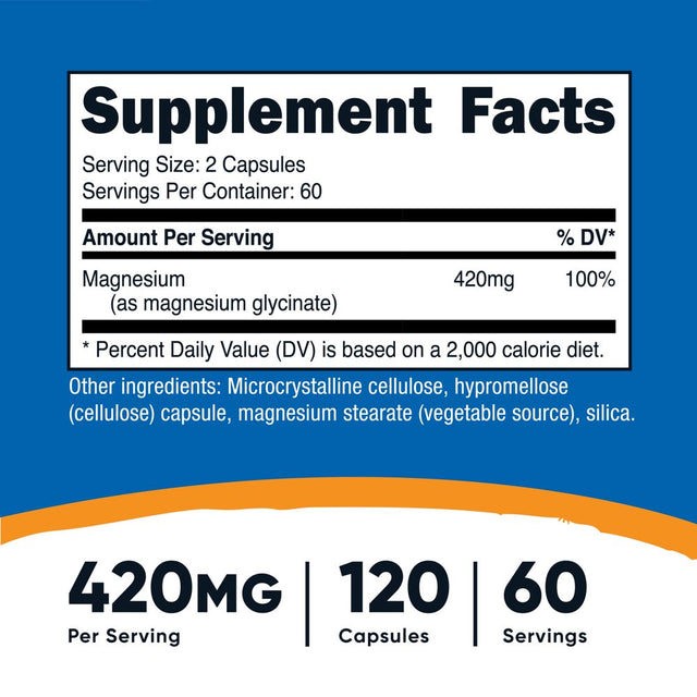 Nutricost Magnesium contains 420 milligrams of magnesium glycinate + magnesium oxide in every serving. 120 capsules for 60 Servings per bottle. Nutricost, located and headquartered in the USA, only uses the best ingredients to ensure maximum quality and to help you feel your best! By keeping our supplement recipes simple and clean, you get the best experience possible with Nutricost. Our supplements are manufactured in a GMP-compliant and FDA-registered facility; and each batch of every product is tested by independent, ISO-accredited laboratories. These statements have not been evaluated by the Food and Drug Administration. This product is not intended to diagnose, treat, cure, or prevent any disease.
