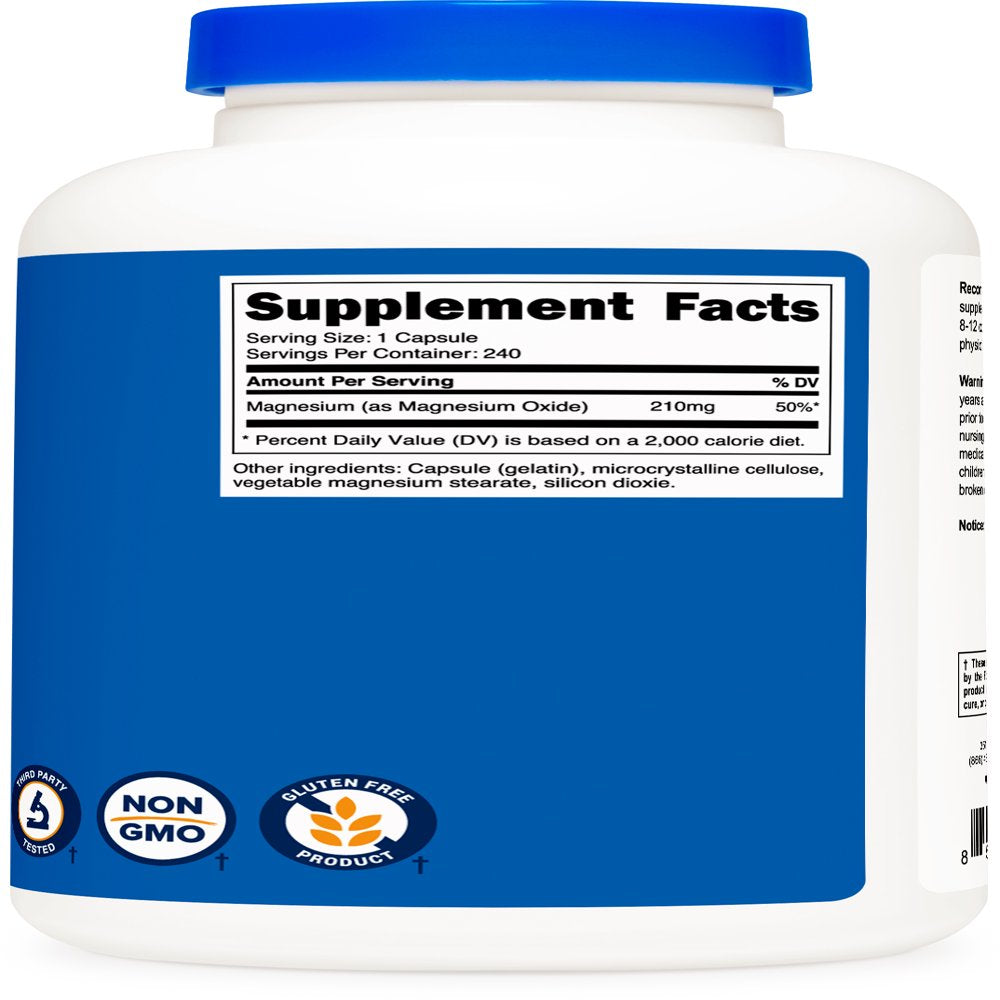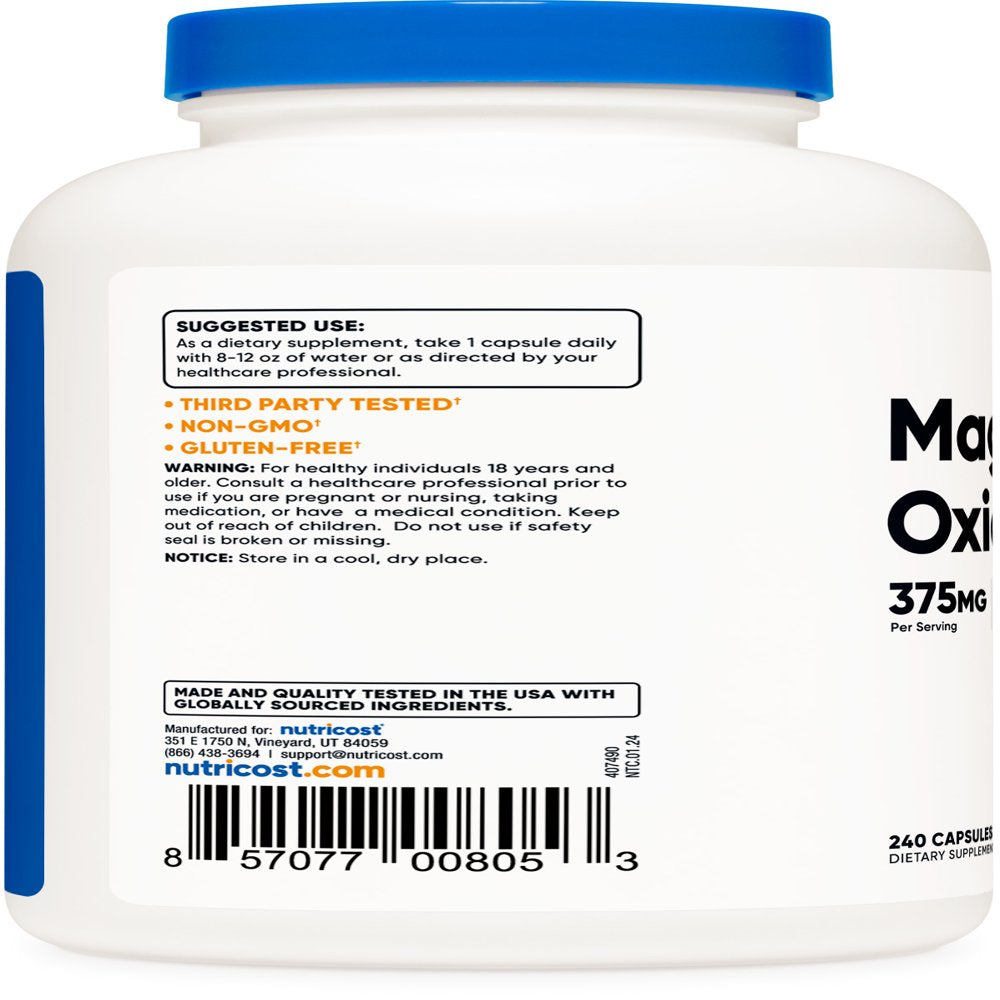 Every easy-to-take, quick release capsule of Nutricost Magnesium Oxide capsules provides 375mg serving dosage of Magnesium Oxide (210mg of Magnesium). Each bottle contains 240 capsules. Nutricost, located and headquartered in the USA, only uses the best ingredients to ensure maximum quality and to help you feel your best! By keeping our recipes simple and clean, you get the best experience possible with Nutricost. All Nutricost supplements are manufactured in a GMP-compliant and FDA-registered facility, provide high-quality ingredients, and offer a variety of options for your health support.