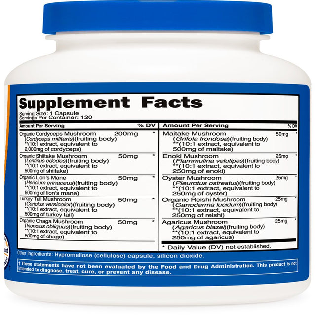 Nutricost's Mushroom Complex contains 5,500mg equivalent of a mushroom blend made up of 10 different mushroom varieties, including Cordyceps, Shiitake, Lion's Mane, Turkey Tail, Chaga, Maitake, Enoki, Oyster, Reishi, and Agaricus mushrooms. Each bottle contains 120 capsules for 120 servings of mushroom complex. Nutricost, located and headquartered in the USA, only uses the best ingredients to ensure maximum quality and to help you feel your best! By keeping our supplement recipes simple and clean, you get the best experience possible with Nutricost. Our supplements are manufactured in a GMP-compliant and FDA-registered facility; and each batch of every product is tested by independent, ISO-accredited laboratories.