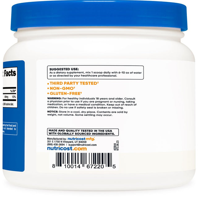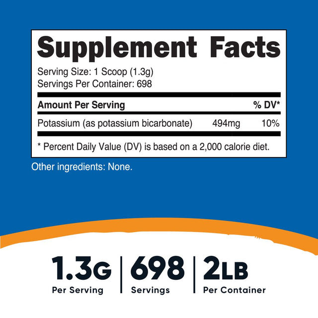 Nutricost Potassium Bicarbonate powder contains servings. Each serving contains 1.3G of Potassium Bicarbonate per serving. It is non-GMO and gluten free. Nutricost, located and headquartered in the USA, only uses the best ingredients to ensure maximum quality and to help you feel your best! By keeping our supplement recipes simple and clean, you get the best experience possible with Nutricost. Our supplements are manufactured in a GMP-compliant and FDA-registered facility; and each batch of every product is tested by independent, ISO-accredited laboratories. These statements have not been evaluated by the Food and Drug Administration. This product is not intended to diagnose, treat, cure, or prevent any disease.