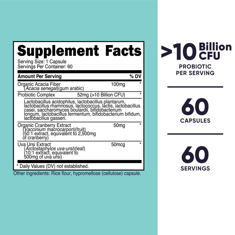 Nutricost's Probiotic for Women provides 60 capsules with >10 Billion CFU each. In addition to the complete probiotic complex, this supplement contains organic acacia fiber, organic cranberry extract, and uva ursi extract. One capsule is one serving.