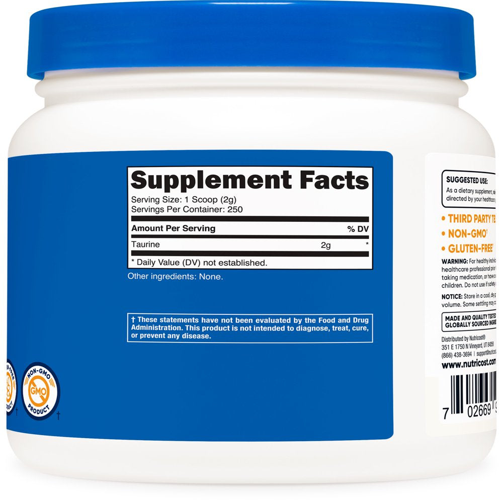 Nutricost Taurine Supplement Powder 500 Grams, 250 Servings