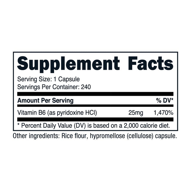 - 25mg Vitamin B6 (Pyridoxine HCl) Per Serving