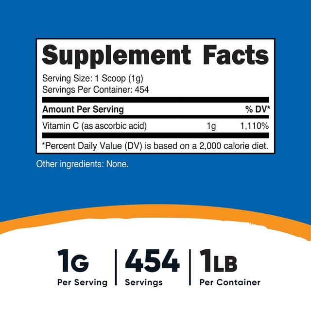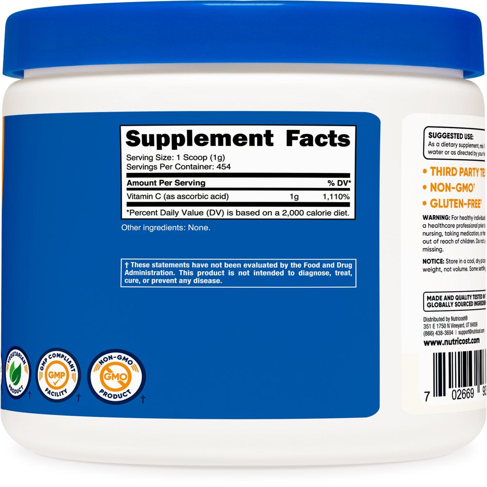 Ascorbic Acid (Vitamin C) is an essential vitamin. Vitamin C is an important factor in many of the body's functions. Unfortunately, Vitamin C is not naturally produced by our bodies. This means that although it is an essential vitamin, it must be replenished every day in order for good health to be maintained. Nutricost's Vitamin C is Non-GMO, Gluten Free & Vegetarian. Each scoop contains 1g of Vitamin C (1,100% Daily Value) and a total of 454 servings per container. Nutricost, located and headquartered in the USA, only uses the best ingredients to ensure maximum quality and to help you feel your best! By keeping our supplement recipes simple and clean, you get the best experience possible with Nutricost. Our supplements are manufactured in a GMP-compliant and FDA-registered facility; and each batch of every product is tested by independent, ISO-accredited laboratories. These statements have not been evaluated by the Food and Drug Administration. This product is not intended to diagnose, treat, cure, or prevent any disease.