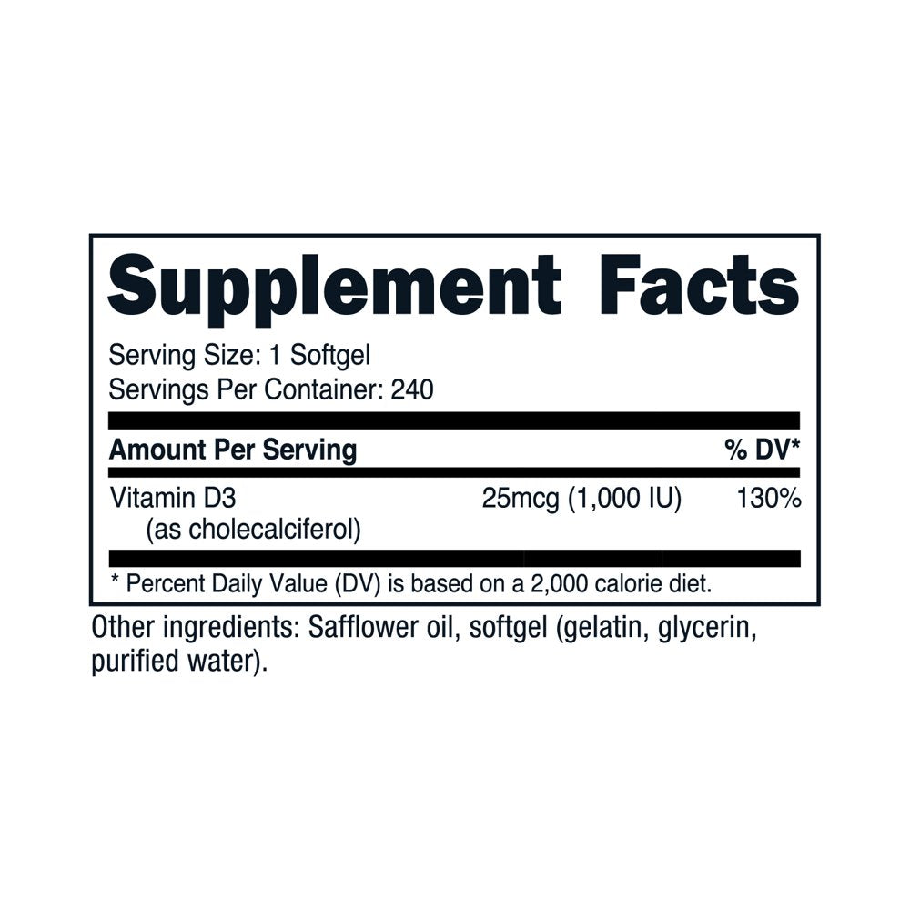 - 1,000iu (25mcg) of Vitamin D3 Per Softgel