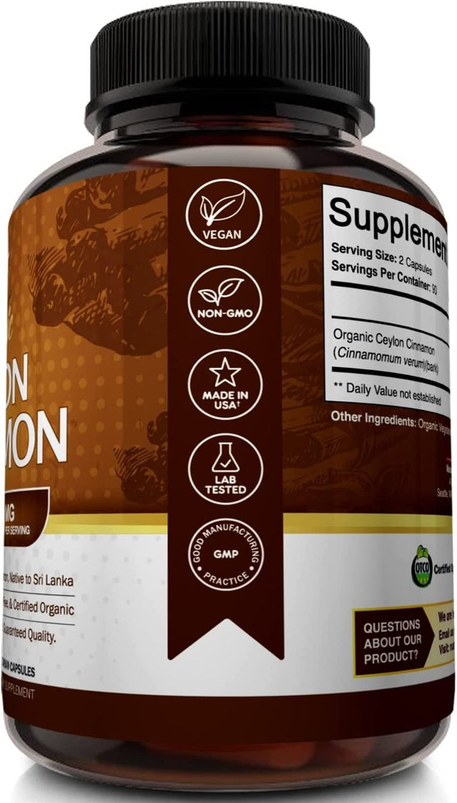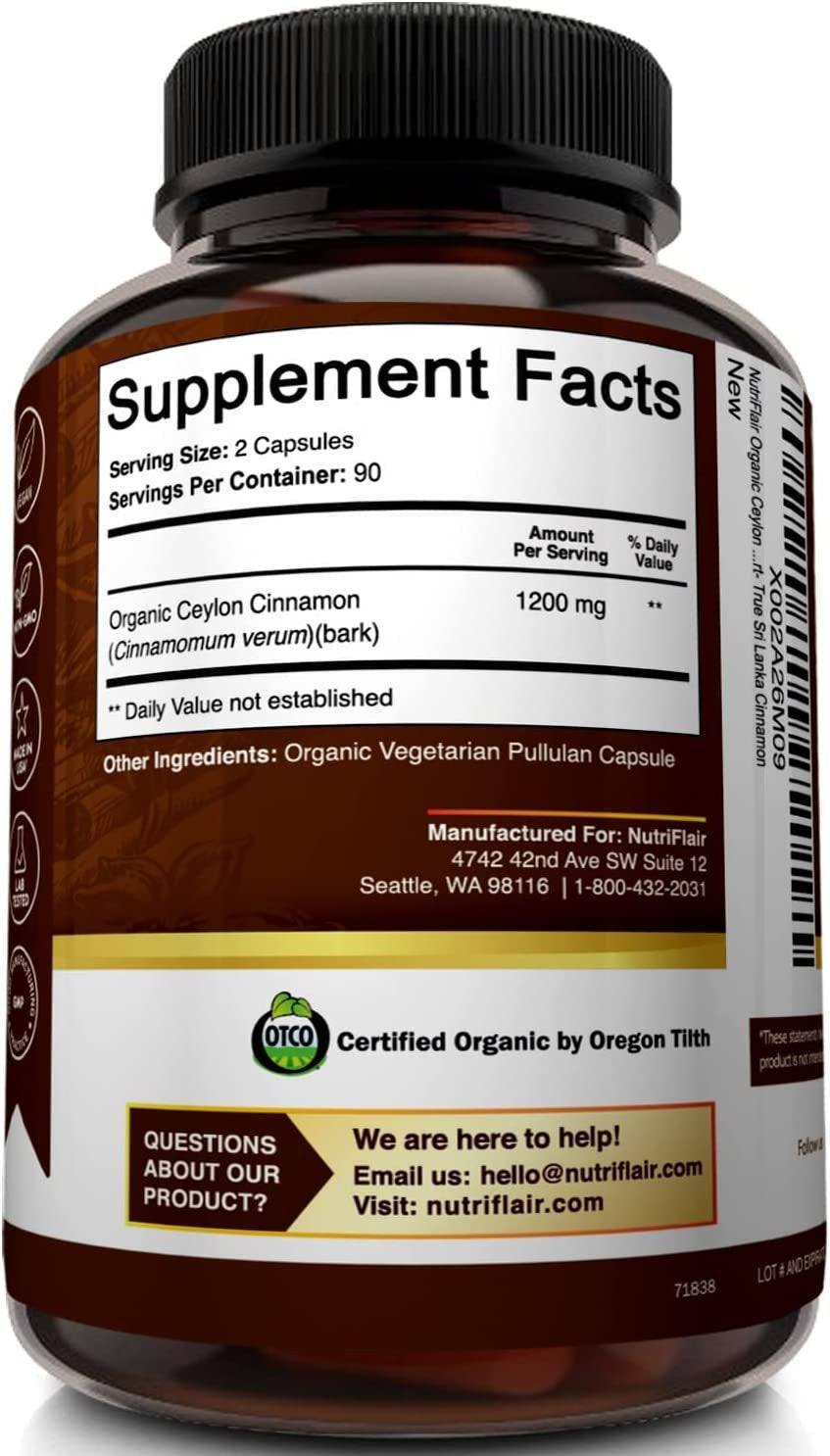 100% Certified USDA Organic Ceylon Cinnamon - 180 Capsules: Contains 180 Vegetarian capsules for a full 90 day supply. Each Serving of 2 capsules provides 1200 milligrams of Ceylon Cinnamon. Ceylon Cinnamon capsules are often combined with NutriFlair Berberine, turmeric curcumin, dim, chromium, silymarin, lions mane mushroom, and/or alpha lipoic acid.