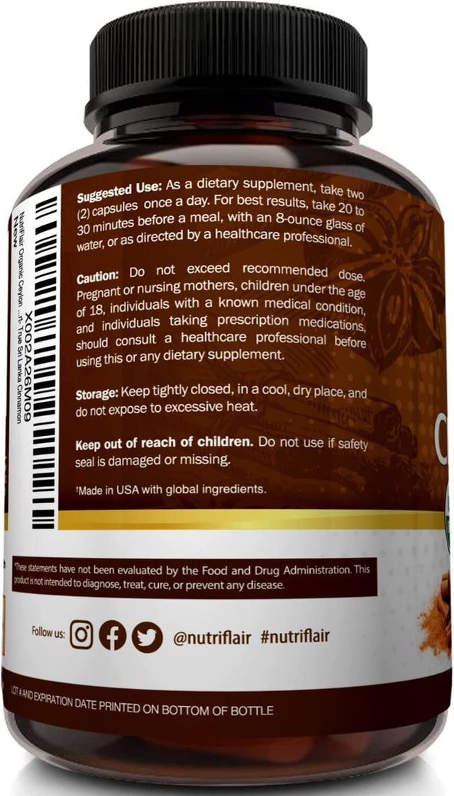 Nutriflair Organic Ceylon Cinnamon Supplement 1200Mg, 180 Capsules - USDA Certified Organic Cinnamon - Non-Gmo, Gluten Free Cinnamon Powder, Antioxidant Cinnamon Pills - Supports Glucose Metabolism is backordered and will ship as soon as it is back in stock.