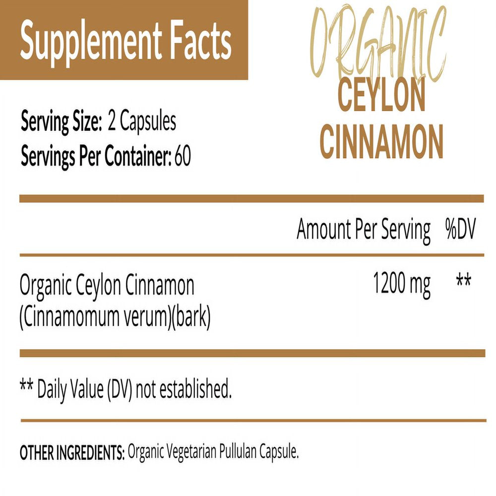 USDA Certified Organic Ceylon Cinnamon 1200 Milligrams per Serving 600 Milligrams per Capsule 180 Capsules Originating from Ceylon Sri Lanka, Ceylon cinnamon has been known as the "true cinnamon" or the "real cinnamon" that possesses outstanding health benefits. This Cinnamon Supplement contains 600 milligrams of Pure, unadulterated Ceylon Cinnamon per Capsule, and 1200 milligrams per Serving. The NutriFlair Ceylon Cinnamon is made with 100% Natural and Pure Ingredients, free of GMO, Gluten, and Dairy.