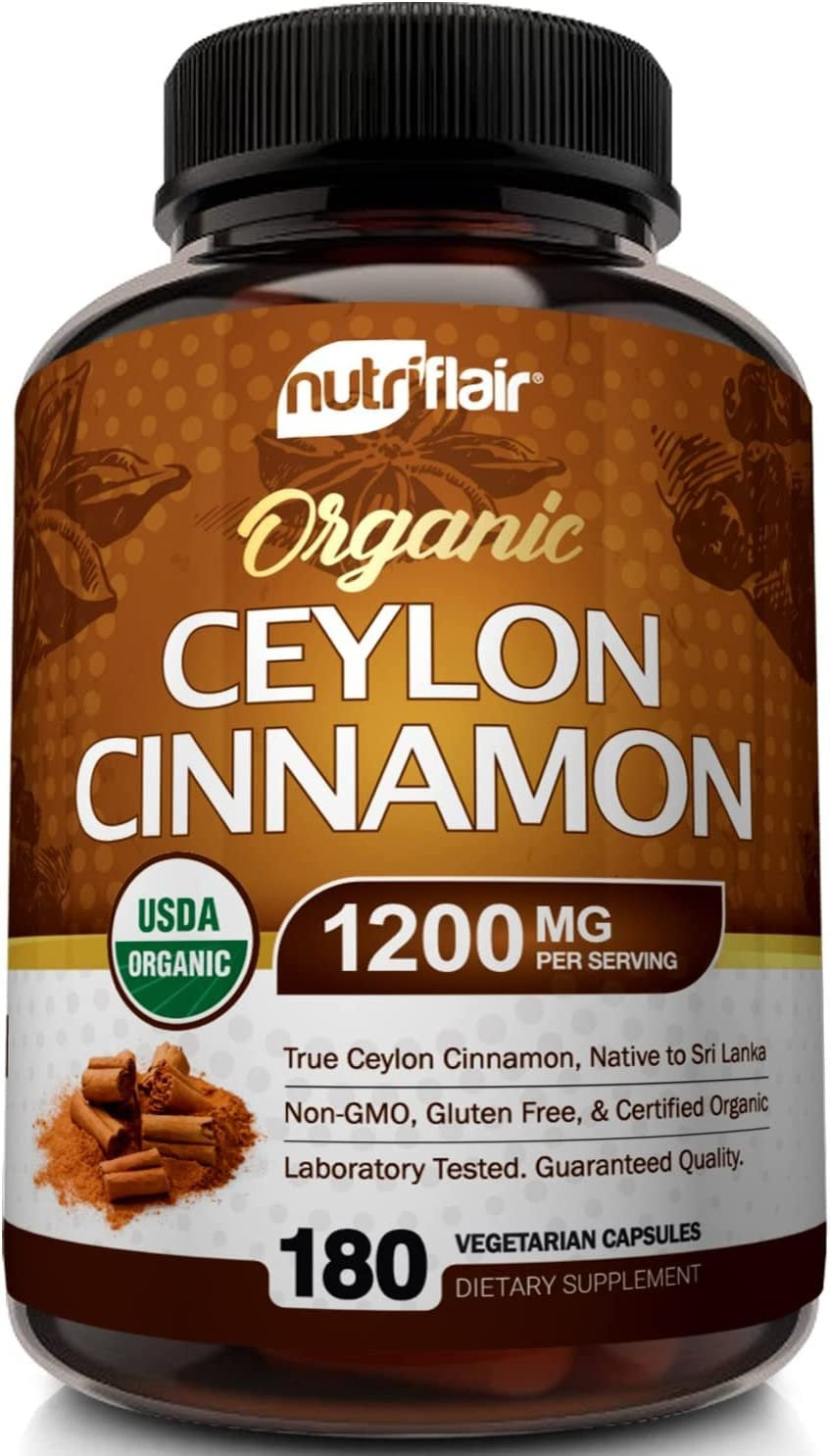 Nutriflair Organic Ceylon Cinnamon Supplement 1200Mg, 180 Capsules - USDA Certified Organic Cinnamon - Non-Gmo, Gluten Free Cinnamon Powder, Antioxidant Cinnamon Pills - Supports Glucose Metabolism