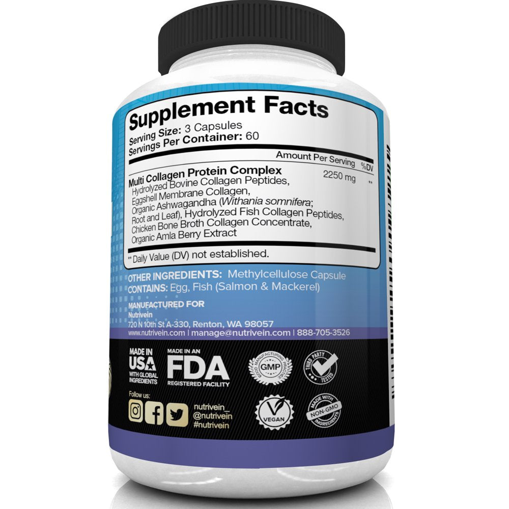 Nutrivein Multi Collagen Pills 2250Mg - 180 Capsules - Healthy Joints, Hair, Skin, Nails
