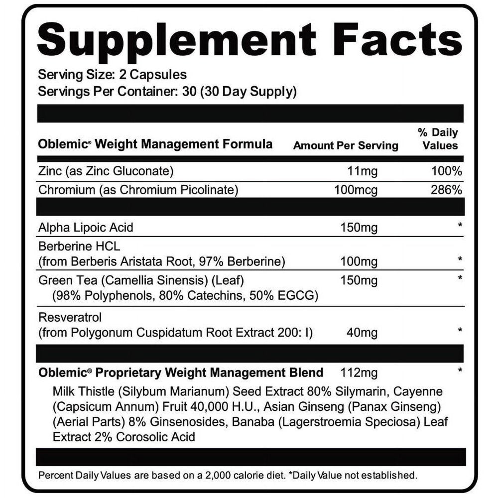 Oblemic Weight Management, Oral Capsules, Natural Alternative 60 Capsules Oblemic is a safe natural alternative to harmful injections. Oblemic switches your body into fat-burning mode with no side effects. Oblemic 1000mg 60 Capsules Insulin sensitivity Oral capsules