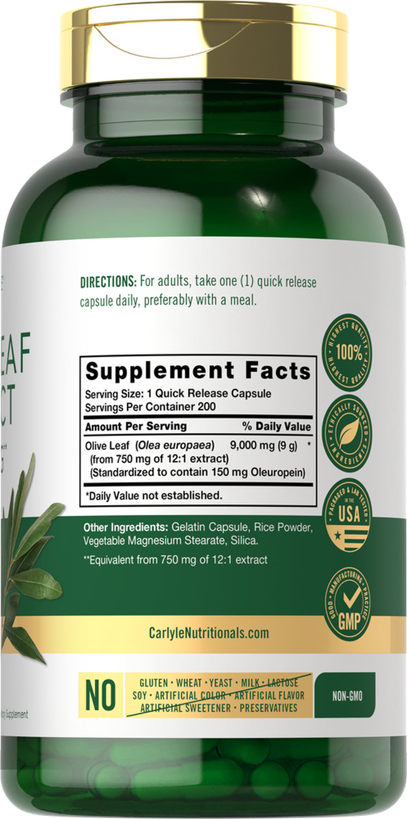 - STANDARDIZED FORMULA: The equivalent of 9,000 mg of Olive Leaf, standardized to 150 mg Oleuropein