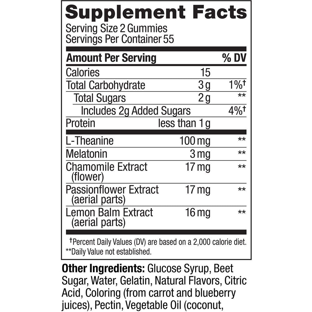 - Chamomile, passion flower and lemon balm soothe and relax110 count