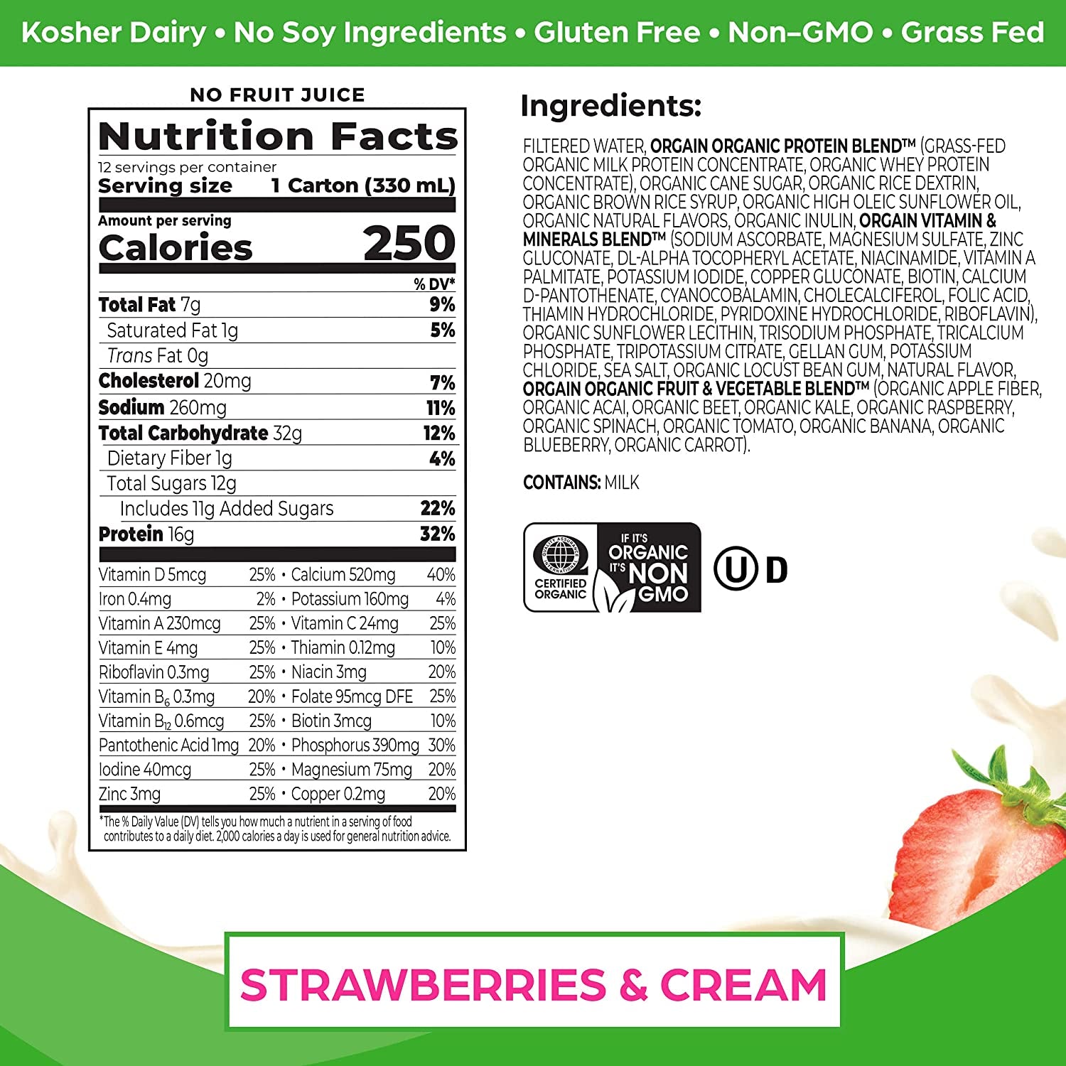 - Orgain organic strawberries & cream nutrition shake contains dietary fiber, 20 vitamins and minerals, 10 fruits and vegetables (including ACAI, spinach, kale), 250 calories per serving.