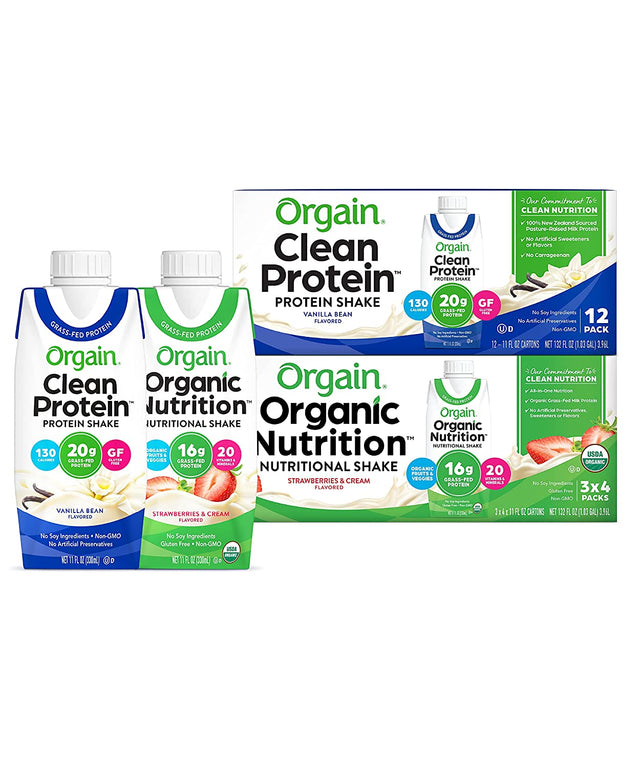 - Includes 12 (11oz) Orgain Clean Protein Grass Fed Vanilla Protein Shakes with 20 grams of protein and 12 (11 ounce) Orgain organic strawberries & cream nutrition shakes with 16 grams of protein.