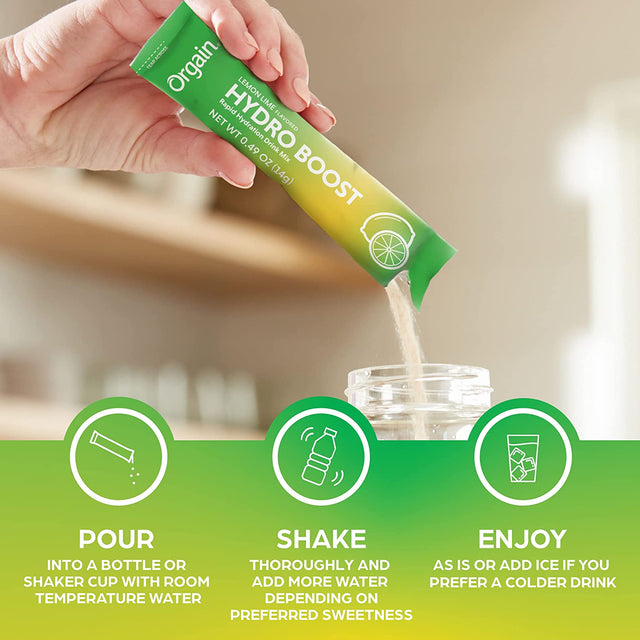 Orgain Organic Hydration Packets, Electrolytes Powder - Lemon Lime Hydro Boost with Superfoods, Gluten-Free, Soy Free, Vegan, Non GMO, Less Sugar than Sports Drinks, Travel Packets, 8 Count