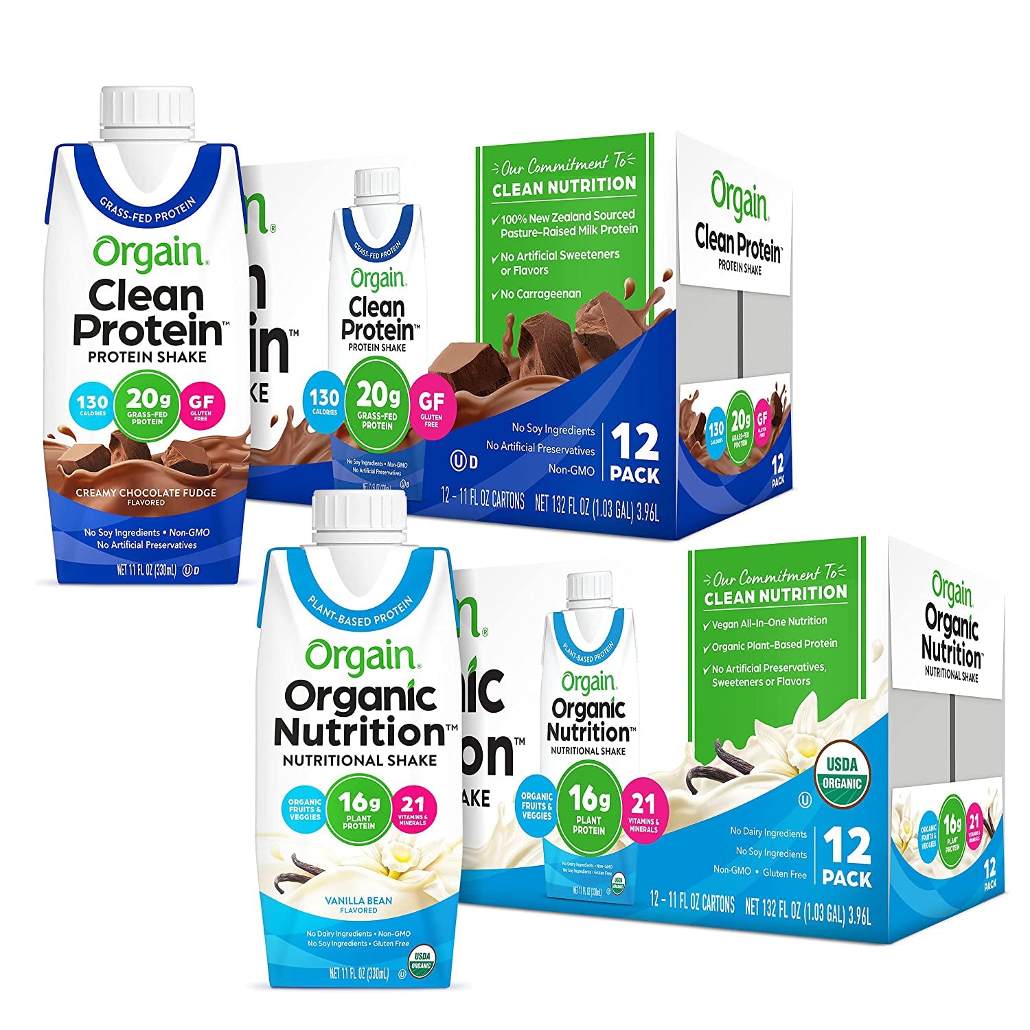 - Includes 12 packs of 11 oz Orgain Organic Nutrition Sweet Vanilla Bean All-in-One Nutritional Shakes and 12 packs of 11 oz Orgain Clean Protein Grass Fed Creamy Chocolate Fudge Protein Shakes.