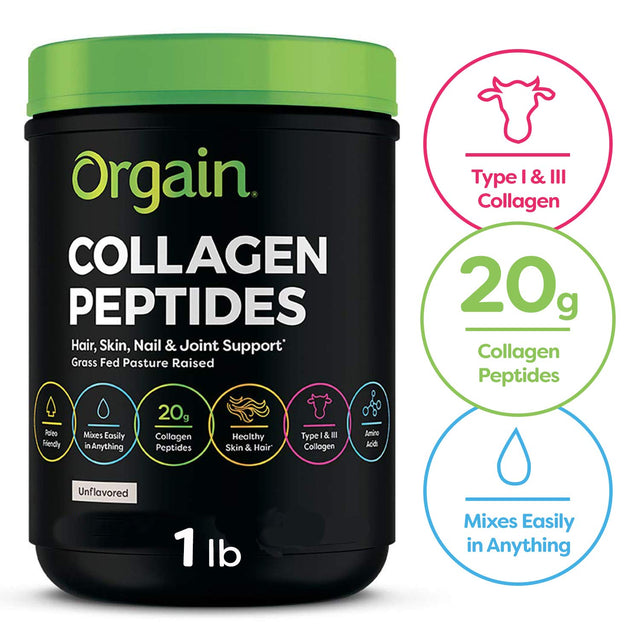 Orgain Collagen Peptides are sourced from grass fed, pasture raised and finished cows to ensure the cleanest, highest quality protein. Our Collagen Peptides are naturally free of gluten, sugar, soy, eggs, fish, shellfish, tree nuts, peanuts, wheat, preservatives and additives. Orgain Collagen Peptides supports joint function, strong hair & nails, muscle recovery, and radiant skin. Orgain Collagen Peptides are more versatile than collagen pills and can be mixed in anything from water, coffee, smoothie mix, or foods.