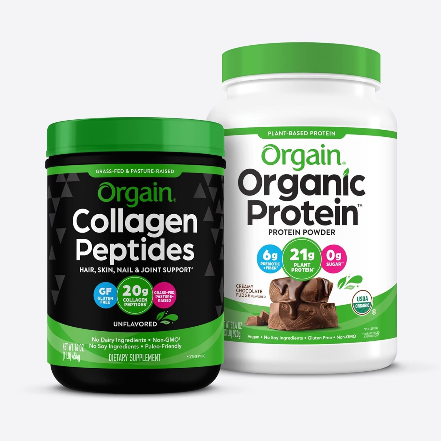 - Includes 1 (2.03 Lb) Orgain Organic Plant Based Protein Powder, Creamy Chocolate Fudge and 1 (1 Lb) Orgain Hydrolyzed Collagen Peptides Powder.