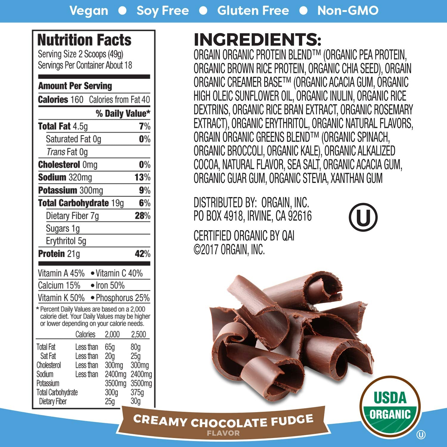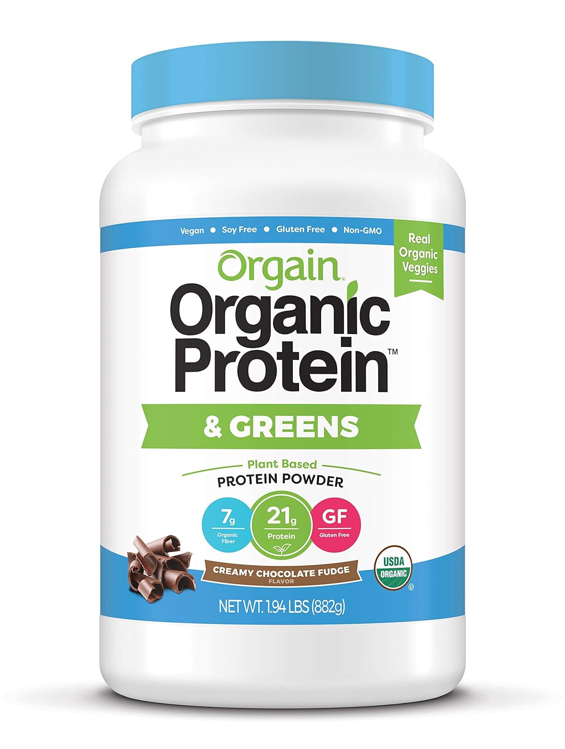 Orgain Organic Plant Based Protein & Greens Powder, Creamy Chocolate Fudge - Vegan, Dairy Free, Gluten Free, Lactose Free, Soy Free, Low Sugar, Kosher, Non-GMO, 1.94 Pound (Packaging May Vary)