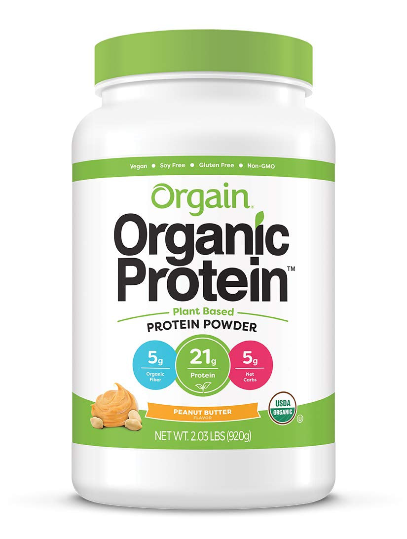 - Orgain Organic Peanut Butter Protein Powder offers 21g of plant-based protein per serving from pea, brown rice and chia seeds.