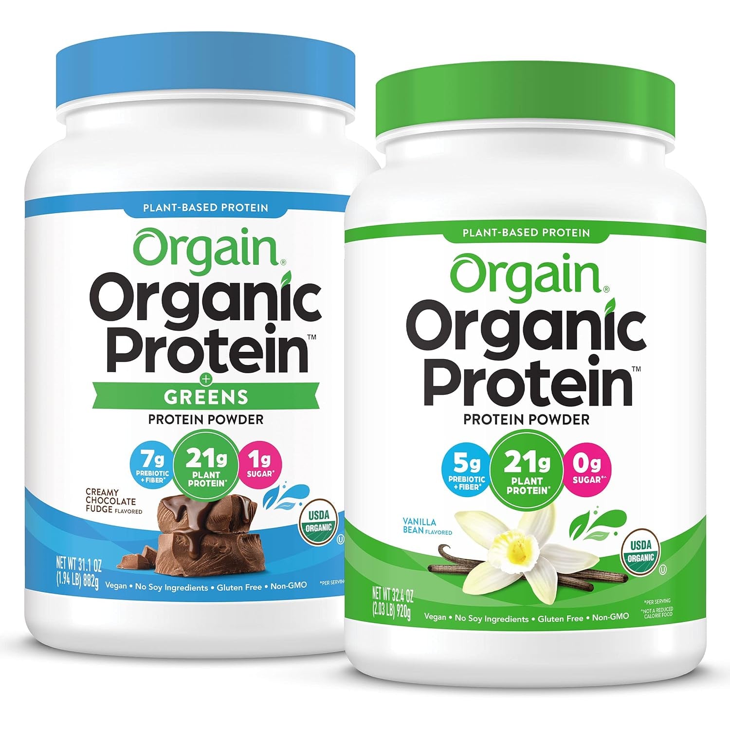 - Includes 1 container of Orgain Organic Protein & Greens Creamy Chocolate Fudge (1.94lb) and 1 container of Orgain Organic Peanut Butter Protein Powder (2.03lb).