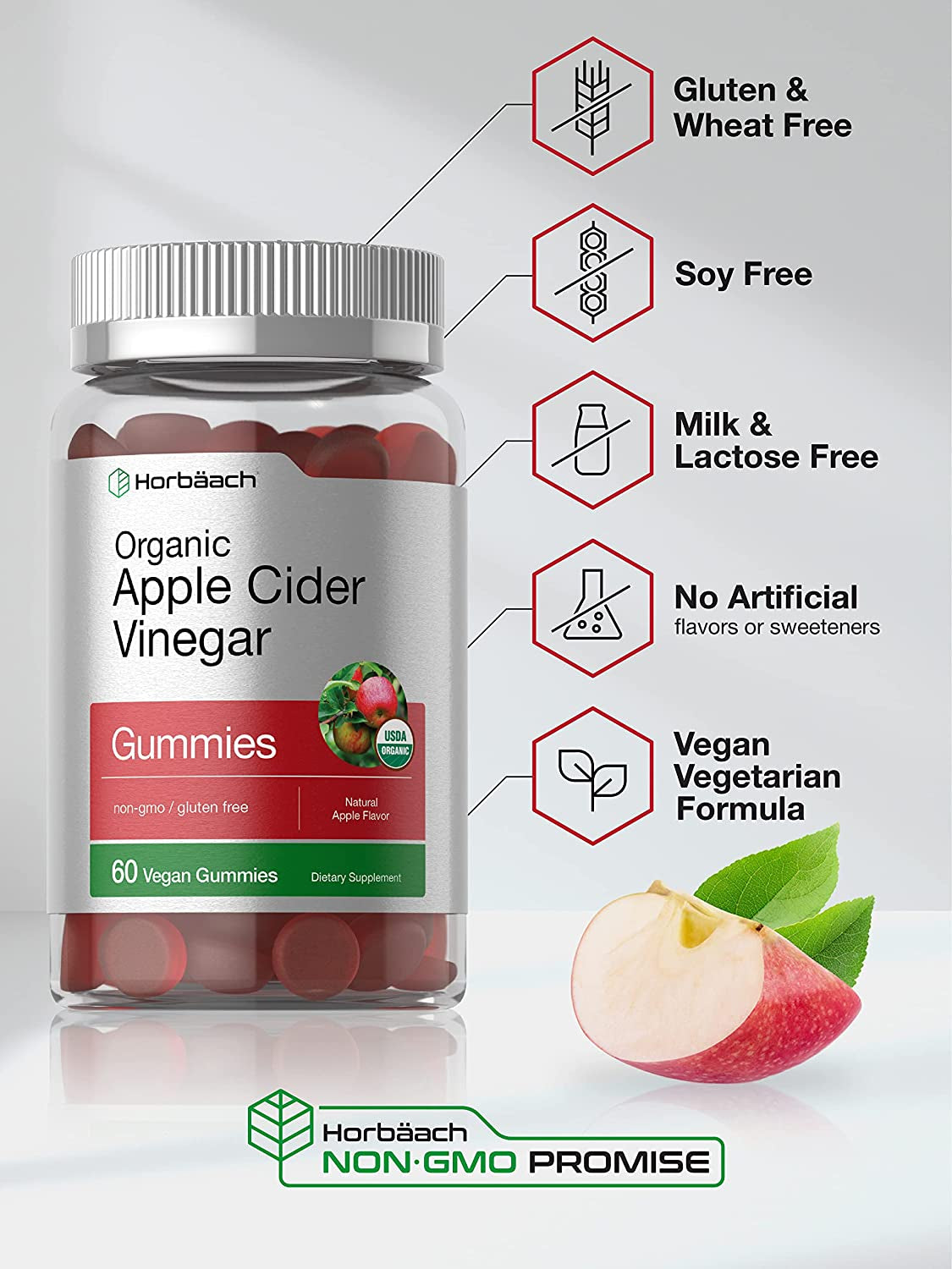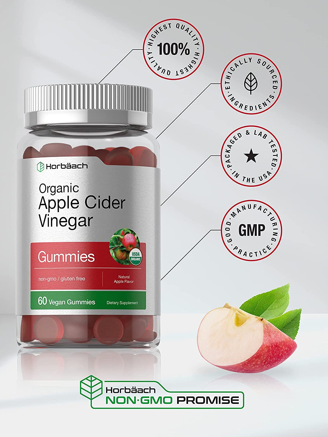 Organic Apple Cider Vinegar Gummies | 60 Gummies | Vegan, Non-Gmo & Gluten-Free Supplement | USDA Certified Organic ACV | Apple Flavor | by Horbaach