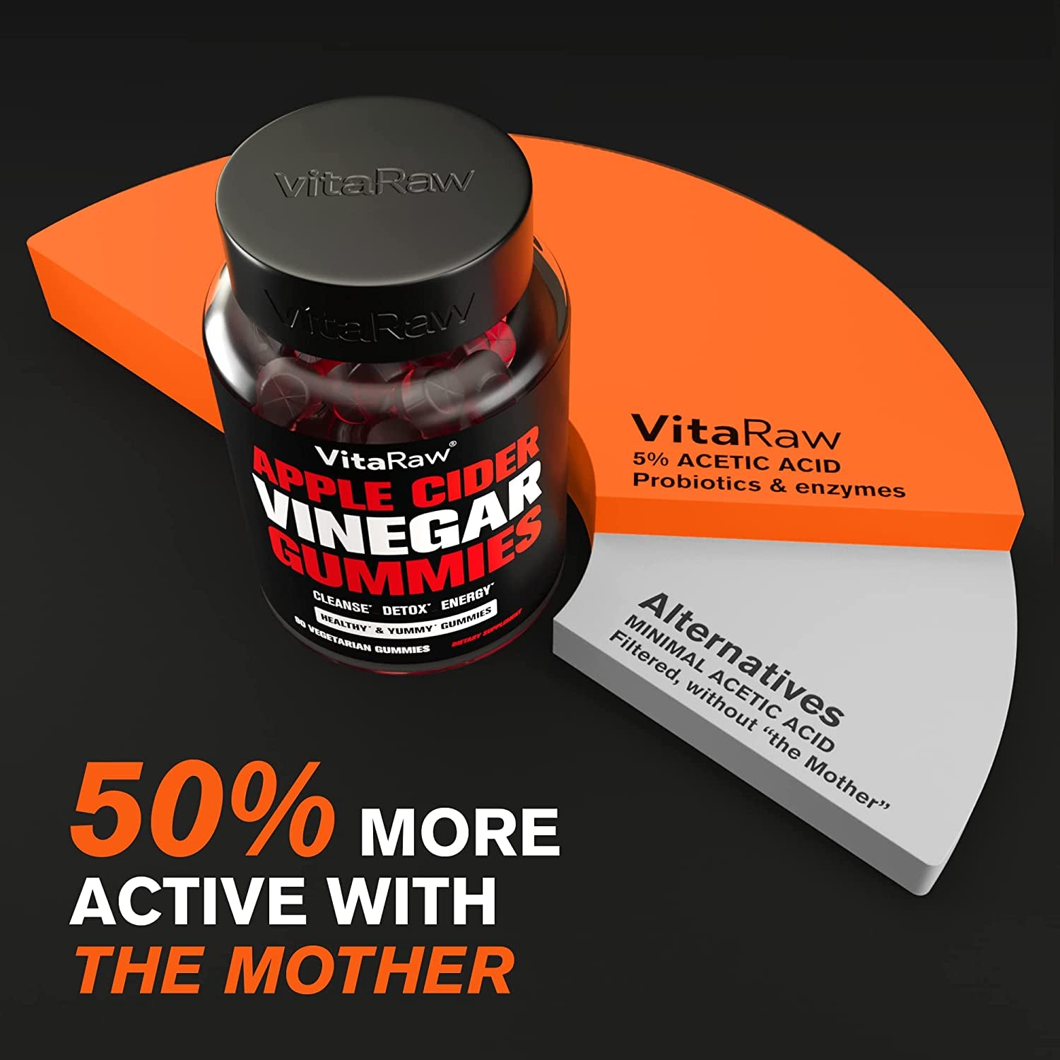 - Up to 50% More Active with "the Mother": Our raw apple cider vinegar with the Mother is biologically active, contains an optimal acetic acid content, and is packed with gut-benefitting enzymes and probiotics.